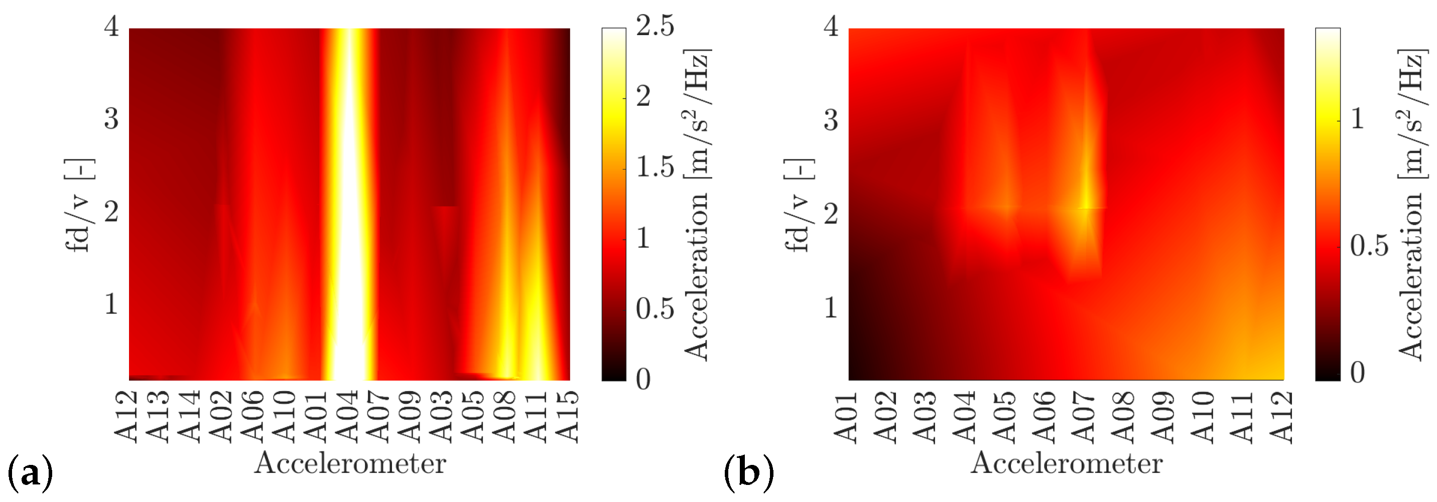 Figure 11b), with a higher fundamental frequency, the S100 train induces higher responses at the pass frequency, the S102 and S130 types at the second harmonic, while the S103 and S104 types cause peaks at the third harmonic.