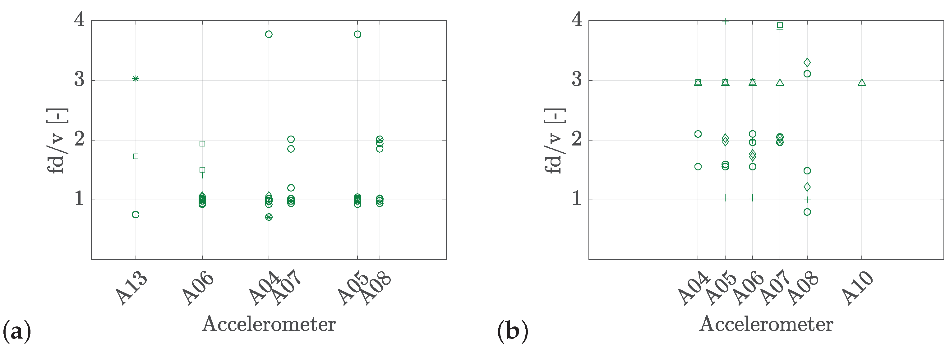 Figure 10 shows the amplitude of the peaks at the frequency response of the forced vibration for all train passages and sensors in both bridges. The frequency is normalized, accounting for the passing frequency of the train. It can be observed that the amplitude of the response is similar in both bridges. However, the response at accelerometers 4 and 8 prevails in the case of the Jabalón bridge in the complete frequency range, while accelerometers 6 and 7 contribute to the response mainly for Arroyo Bracea I bridge, at the frequencies of the second and third harmonics of the excitation.