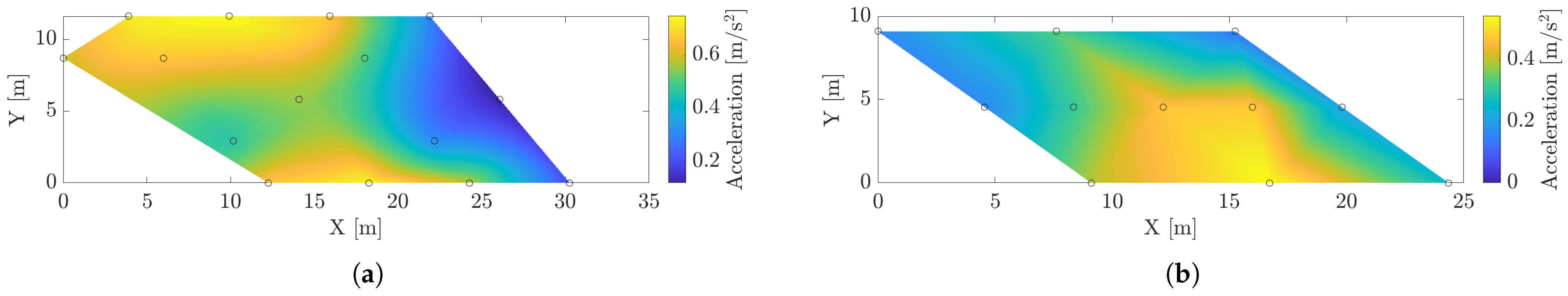 During the experimental campaign, the vertical acceleration response of the bridge deck was recorded at 11 measurement points distributed along the lower horizontal face of the flange of the prestressed concrete girders (points 1–11 in
