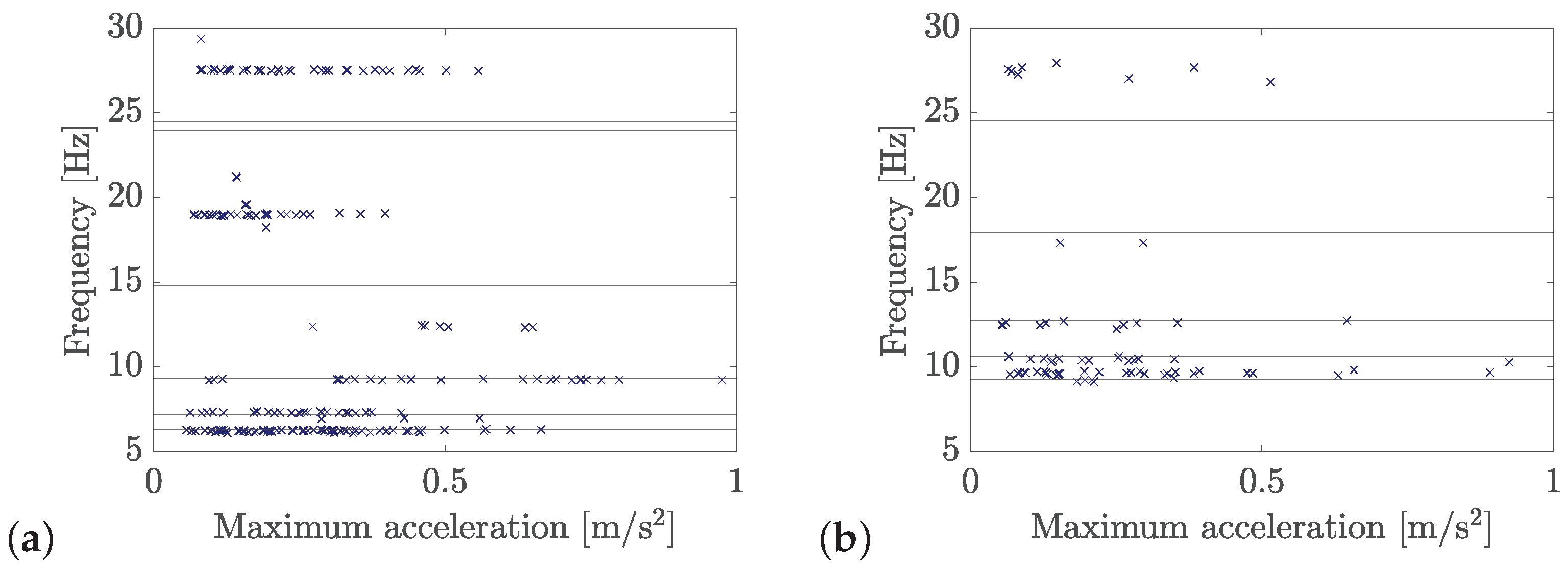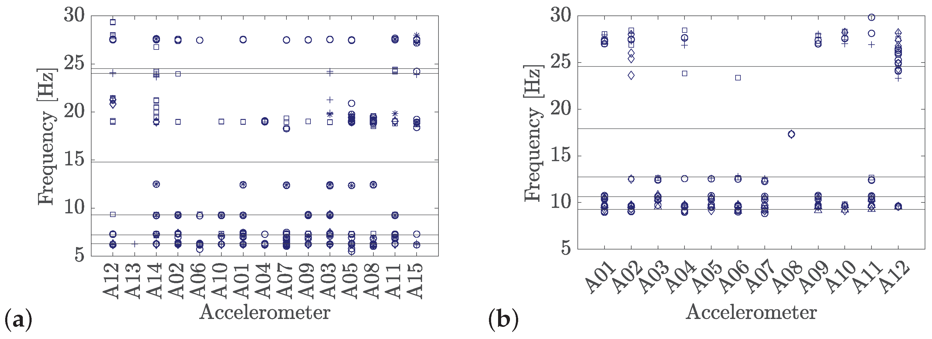 Figure 14 presents the peaks identified in the frequency response of the free vibration for all the sensors and train passages. The horizontal lines stand for the natural frequencies estimated by operational modal analysis using ambient excitation. It is clearly visible that some natural frequencies were not identified in the case of Jabalón bridge (
