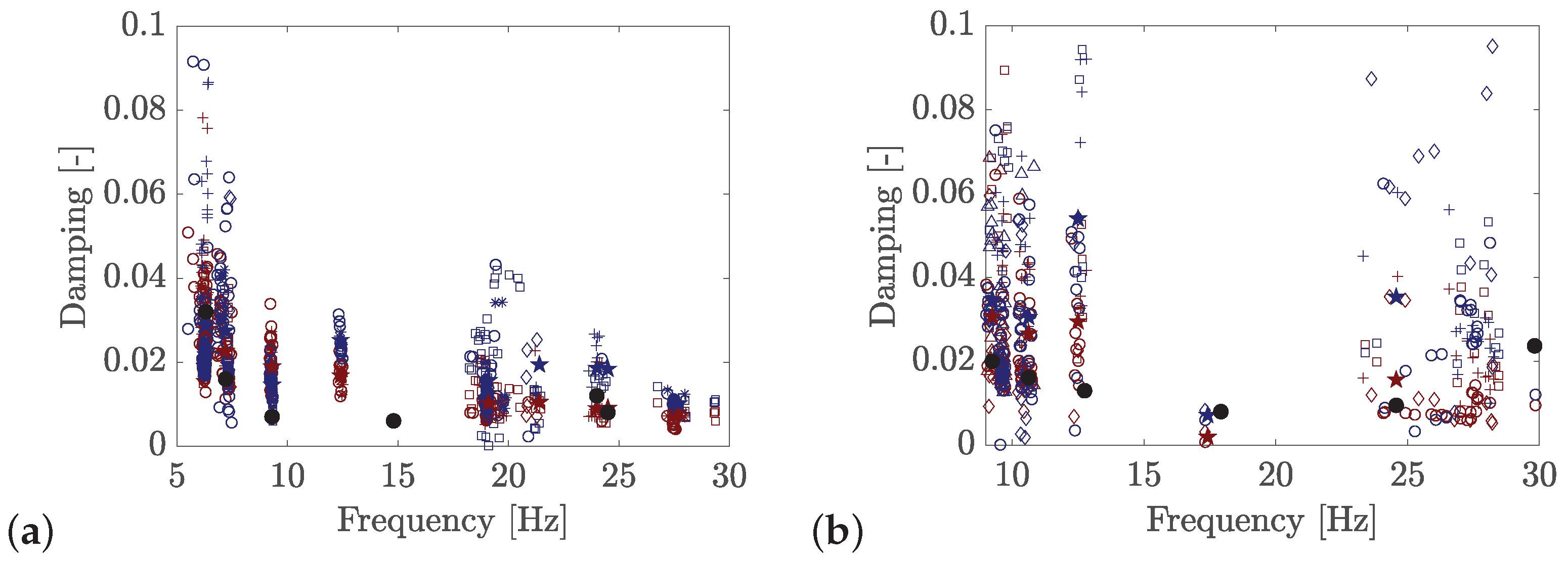 Figure 18 presents the estimations of the modal damping ratios by the half-power bandwidth method and the random decrement technique using all experimental campaign recordings. The pentagrams indicate the mean value. The results present high dispersion due to uncertainty of the damping ratio, which is affected by several variables. However, the mean values for Jabalón bridge (