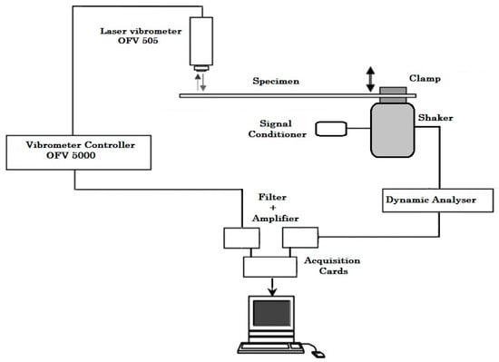 The vibrometer controller OFV-5000 in Figure 1 was used to provide signal to the sensor head, to power the laser vibrometer, and to process the vibration signal. Its digital/analogue decoder was used to transform the analogue electrical signal from the laser to digital signal, which was subsequently filtered. The signals were converted by decoders to obtain velocity and displacement readings from the tested structure [13]. Two filter amplifiers were used to filter and amplify the laser vibrometer and shaker signals before they were sent to the acquisition cards. The acquisition cards transformed the electrical continuous signal from the different equipment to a digital signal for processing in the Labview [14]. The response and excitation signals were digitalised and processed by the dynamic analyser of signals. The analyser connected to the PC performed the acquisition of signals, control of acquisitions conditions, including frequency range and sensibility, and the analysis of the signals acquired, such as signal recording, Fourier transform, and frequency response. This system configuration allows for a real-time Fourier transform.