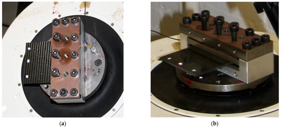 Composite panel sample clamped in the shaker: (a) top view; (b) side view.