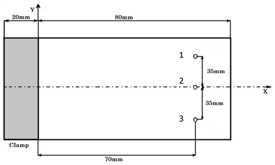 Figure 3 illustrates the composite plate with the positions of the points used for velocity measurements. The three measurement points were chosen to be able to capture different vibration modes. For the sake of repeatability, three equivalent tests were carried out in the same conditions, and the results were compared. The output of the measurements was the velocity at three measuring points in the time domain, .