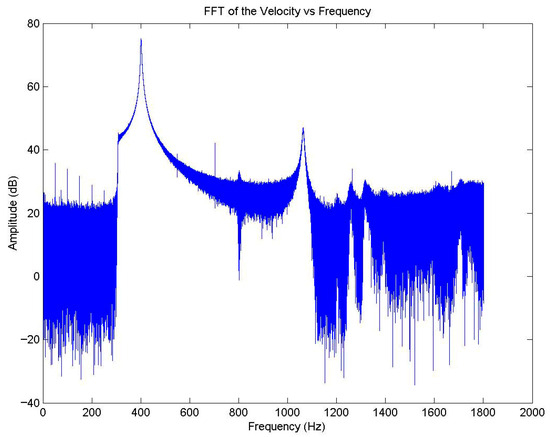 To compensate for the motion of the clamp, it is necessary to subtract the clamp’s displacement from the panel response. For that purpose, different integration methods of the acceleration achieved by means of the accelerometer arrangement at the clamp were considered, including the fourth order Runge–Kutta and forward and backward Euler methods, which required over a million integration steps and unacceptable accumulation of the numerical errors. To minimise the error, the measurement was taken with the laser vibrometer pointing to the clamp and the same sampling frequency aiming at the clamp, so an analogous signal was obtained and easily compared with the plate response. It was impossible to subtract the two signals directly in the time domain due to the difficulty of synching the two signals; hence, the subtraction was carried out in the frequency domain following the Fourier transformation. Analysis of the subtracted signals also revealed that this step needed to be conducted with the filtered data. Figure 14 shows the filtered plate response in the frequency domain after the subtraction of the filtered motion of the clamp where the obtained noise in the unexcited areas was below 5 dB.