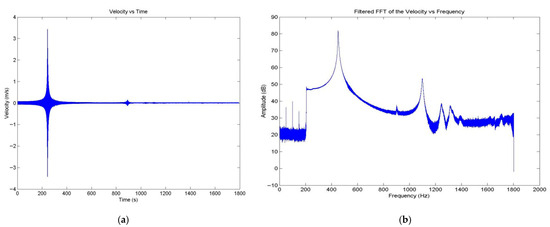 Velocity results obtained with Orientation 2 at 1 Hz/s of sweep rate: (a) time domain and (b) frequency domain.