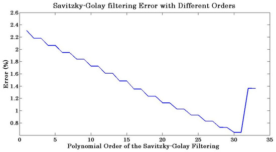 Errors obtained for a range of the polynomial orders of the Savitzky–Golay filter.