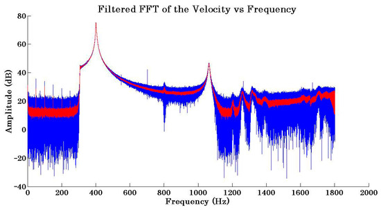 FFT of the velocity with (red) and without (blue) a three-order one-dimensional median filter.