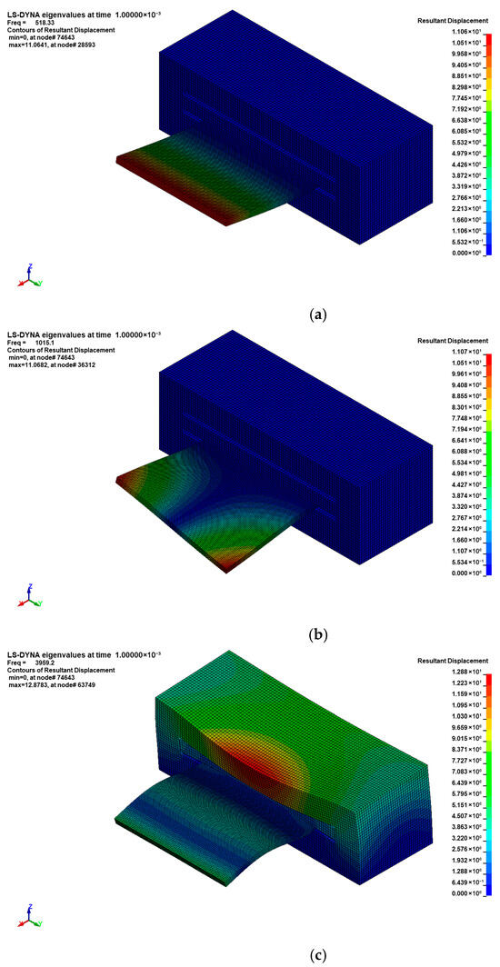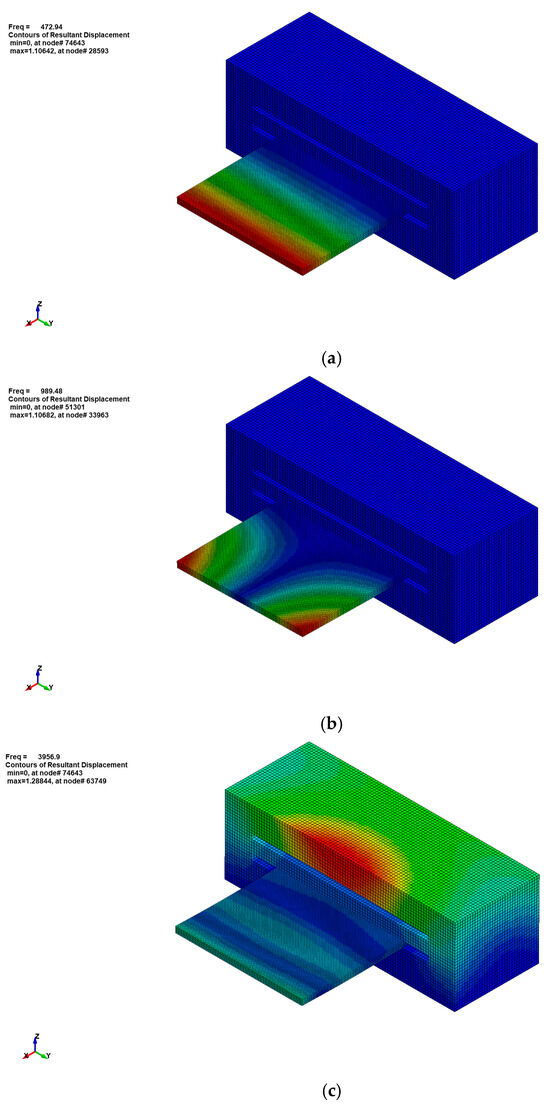 FEM results for the composite panel with Orientation 1 mode shapes: (a) mode 1 with ; (b) mode 2 with ; and (c) mode 6 with .