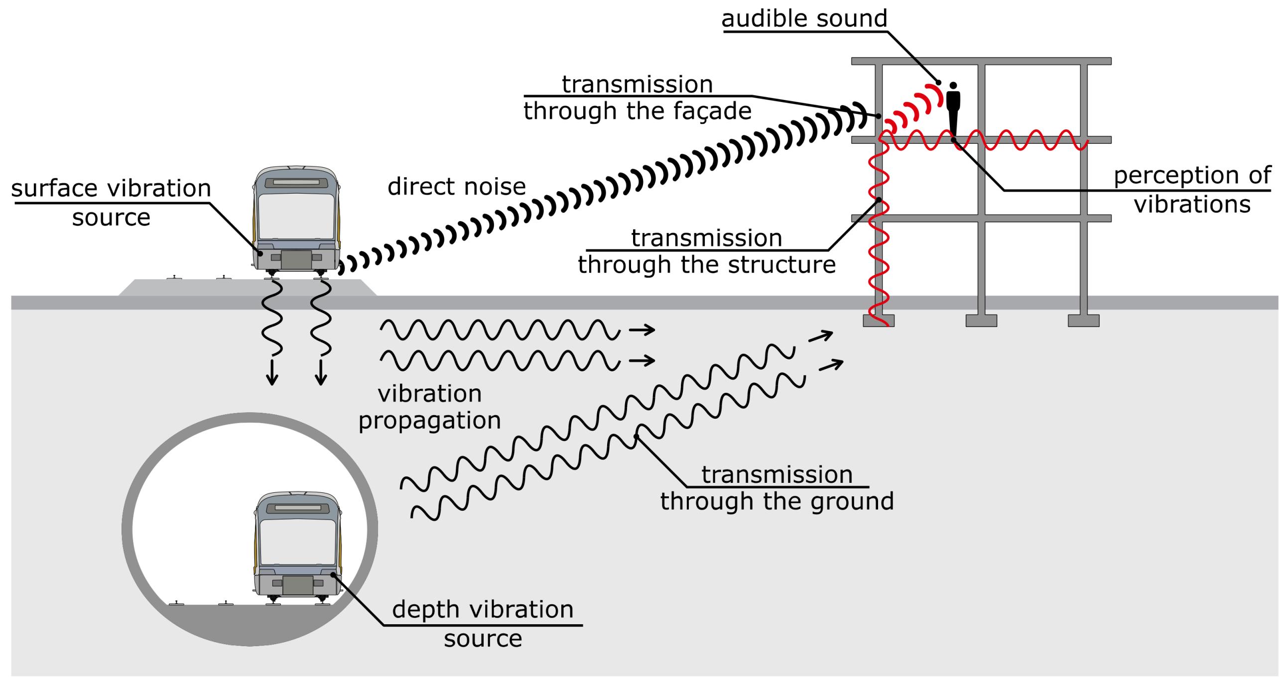 - Generation, propagation, and reception: The fundamental mechanisms of how vibrations and noise are generated, transmitted through the ground, and perceived at the receiver have been discussed. The general tendencies identified for each influencing factor are highly valuable as a first step in the analysis of specific cases.