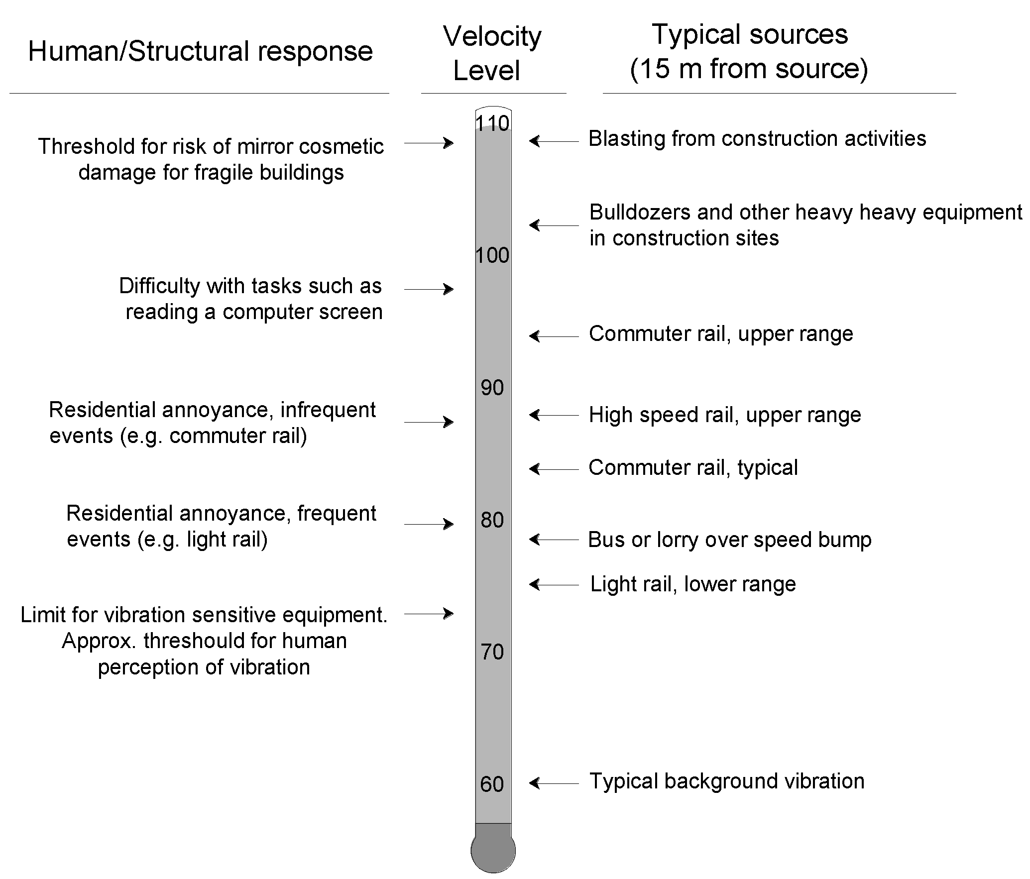 - Indirectly, by limiting the RMS vibration velocity levels integrated over 1/3-octave frequency bands with centre frequencies between 16 Hz and 250 Hz, measured at the building’s structural slabs.