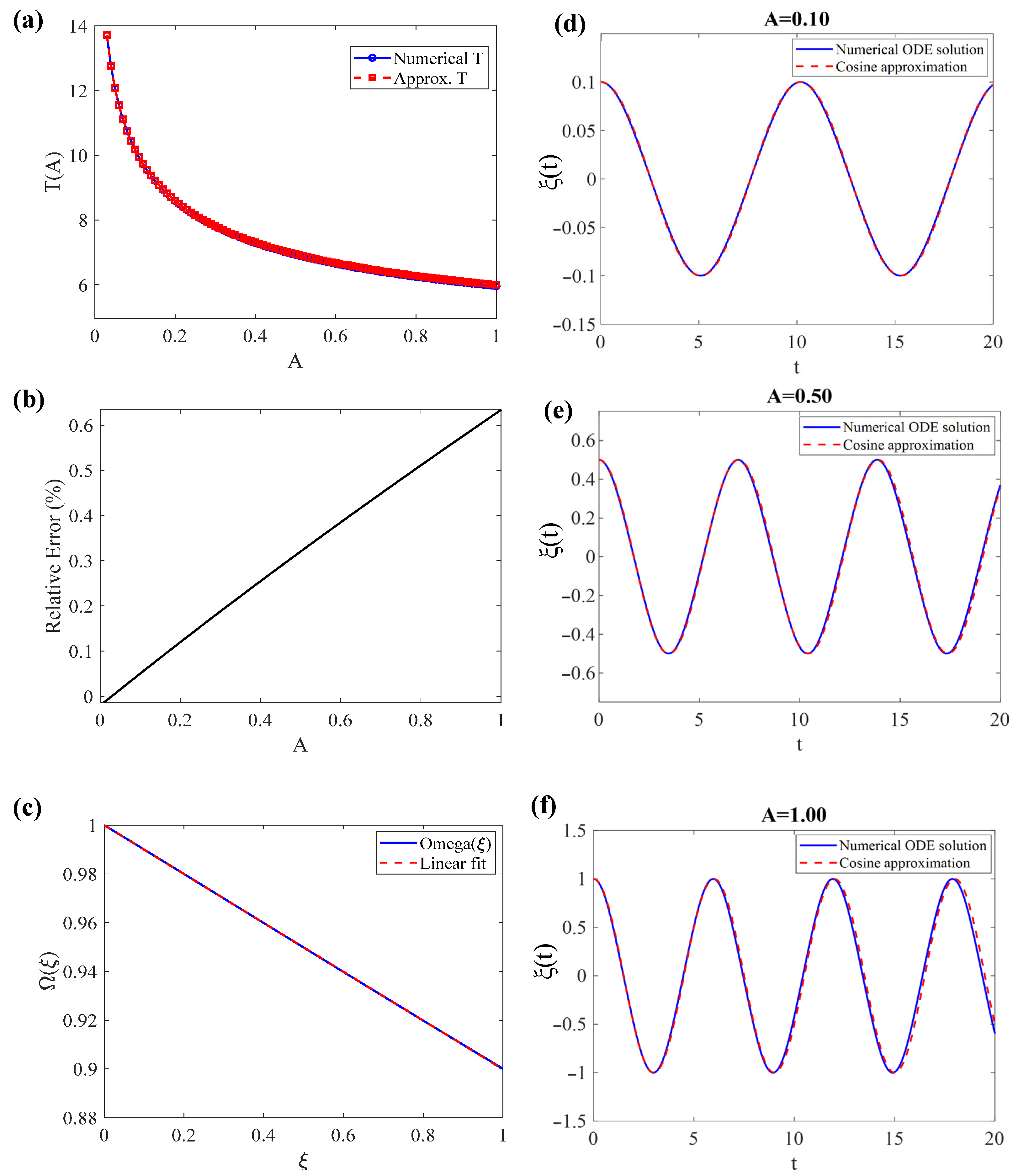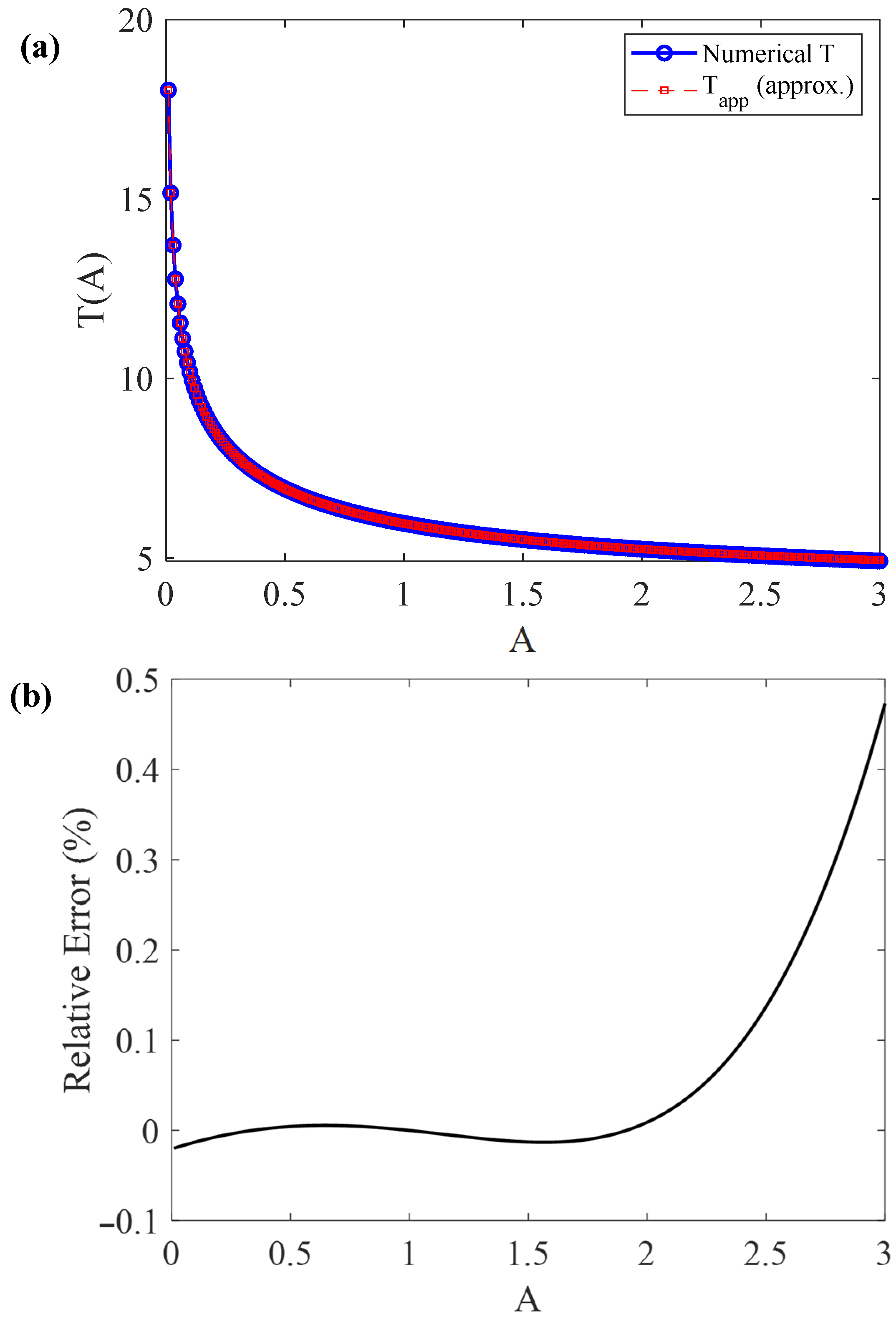 . Consequently, the use of the average value in Equation (27) accurately captures its net effect over the oscillation cycle. The resulting approximate period is nearly identical to the numerical value obtained from the exact integral. The domain of validity of the method is therefore well defined. The approximation remains accurate as long as the amplitude does not exceed