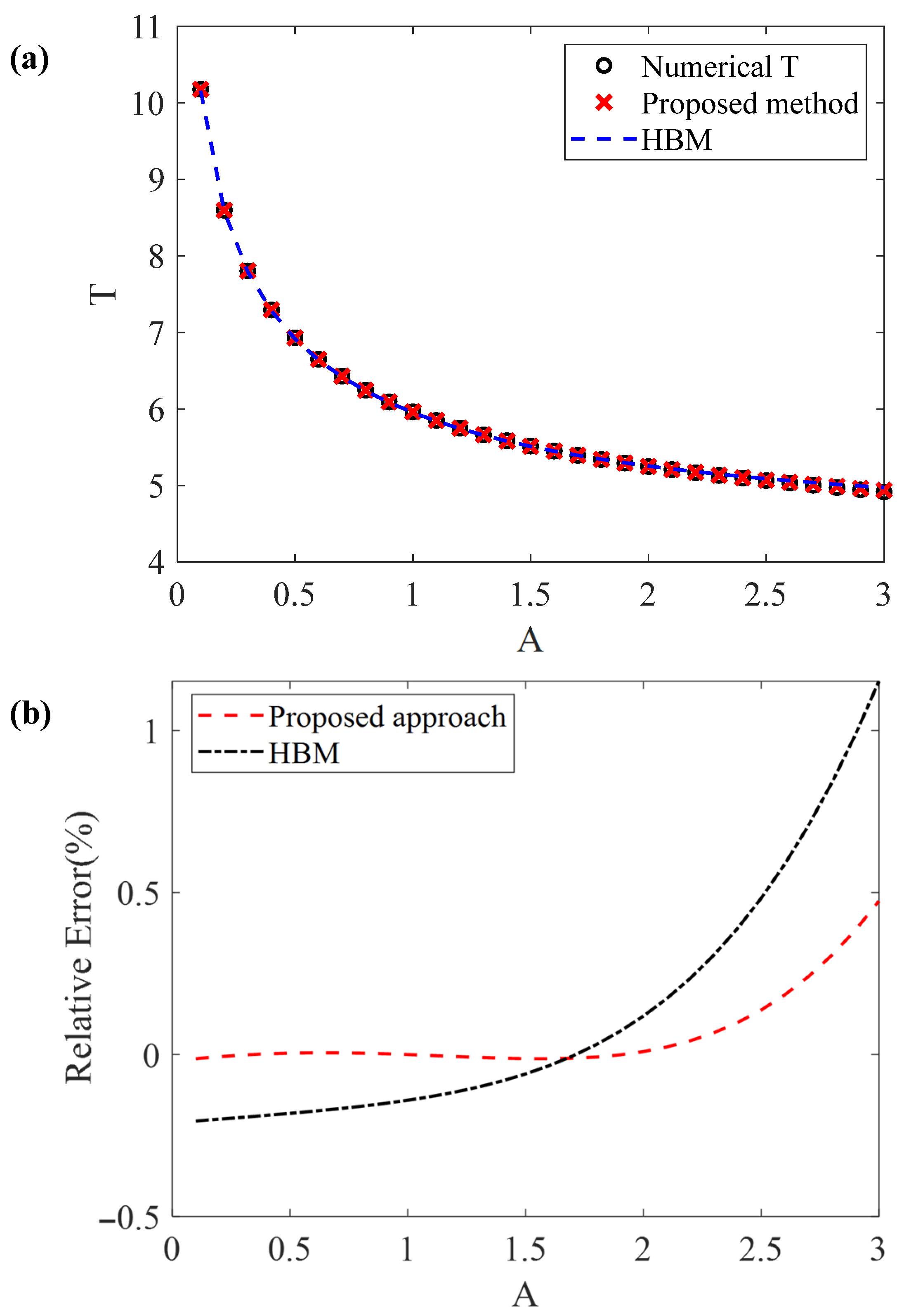 The numerical results for the oscillation period obtained using the numerical solution (Equation (23)), the proposed approach (Equation (37)), and the HBM (Equation (57)) are presented for comparison in