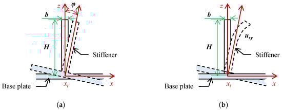 where w s y , b e n d and φ s y , t w i s t represent the bending deflection and cross-sectional twist angle of the stiffener with the neutral axis along the y-direction, respectively, while w p ( x , y ) denotes the transverse deformation displacement function of the base plate. The deformation of the stiffener represented by the cross-sectional twist angle φ in Equation (2) is illustrated in Figure 1a. It is assumed that the cross-section of the stiffener remains unchanged during torsion (i.e., no relative displacement occurs between points on the cross-section), and the section undergoes rigid rotation about the junction between the stiffener and the base plate.