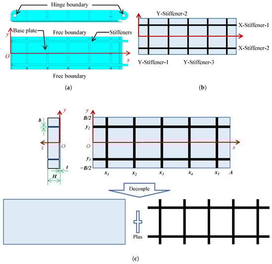 Stiffened plates are widely used in wind tunnels, characterized by a relatively high ratio of stiffener height to base plate thickness. Figure 2a illustrates the typical structure and boundary condition of the wind tunnel stiffened plate. The structure comprises a rectangular base plate with both longitudinal and transverse stiffeners. The base plate is hinged along the x-direction boundaries and free along the y-direction boundaries.