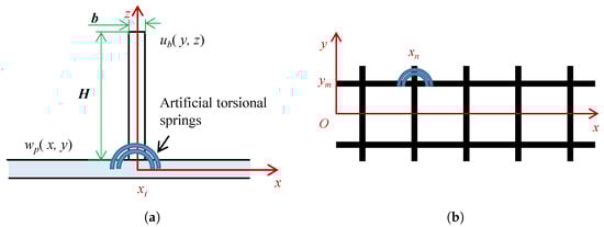 Deformation governing equations for both the base plate and the stiffeners are established using plate/shell theory. Their displacement functions (base plate–stiffener and stiffener–stiffener) are mutually independent, thus requiring specific measures to establish interconnections between these equations. At stiffener–base plate junctions, rotational continuity is assumed such that the rotation of the stiffener transverse to the base plate equals the rotation of the base plate transverse to the stiffener. This constraint is transformed into an energy functional via the penalty function method [30,34,35], which introduces virtual torsion springs at junctions (Figure 3) to enforce rotational compatibility through spring potential energy. The potential energy of the torsion springs at the junction between the base plate and the nth stiffener in the x-direction is expressed as