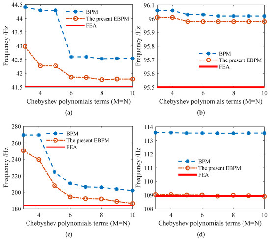 Figure 6. Convergence of numerical solutions obtained by the BPM and EBPM with boundary conditions FFFF and SSFF. (a) First-mode frequency (FFFF). (b) First-mode frequency (SSFF). (c) Second-mode frequency (FFFF). (d) Second-mode frequency (SSFF).