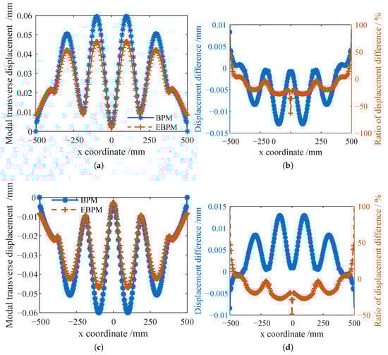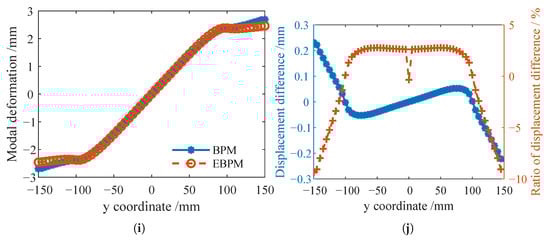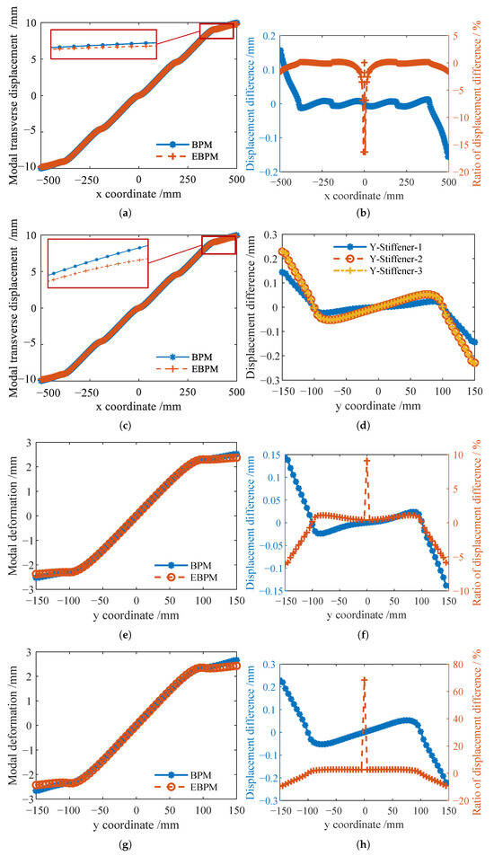 Stiffeners at the locations shown in Figure 2b were selected for analysis. Two stiffeners along the x-direction were chosen to comparatively analyze the influence of symmetric arrangement on their deformation. Three stiffeners on one side along the y-direction were selected to examine the effect of stiffener location on deformation. Using the displacement at the top point of the stiffener cross-section as the deformation value, the differences in deformation displacements calculated by the EBPM and BPM were compared and analyzed. To quantitatively compare the differences in transverse modal deformation displacements of the stiffeners solved by the EBPM and BPM, the displacement difference and its ratio to the local deformation displacement are defined as