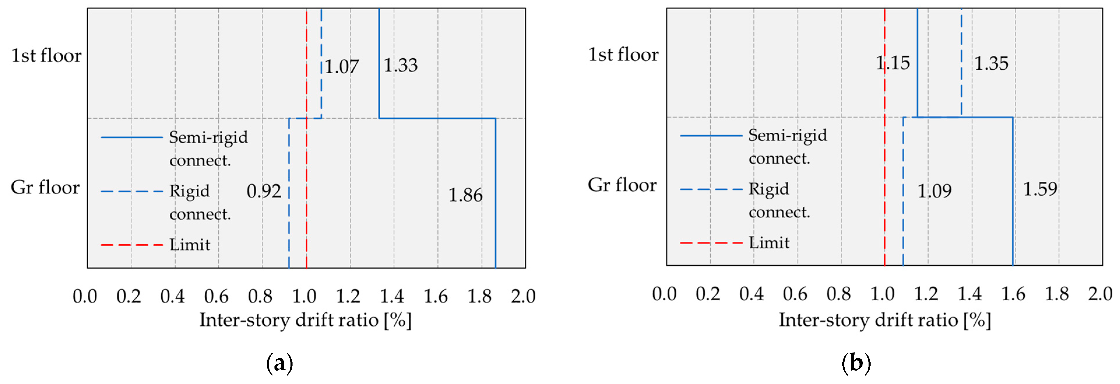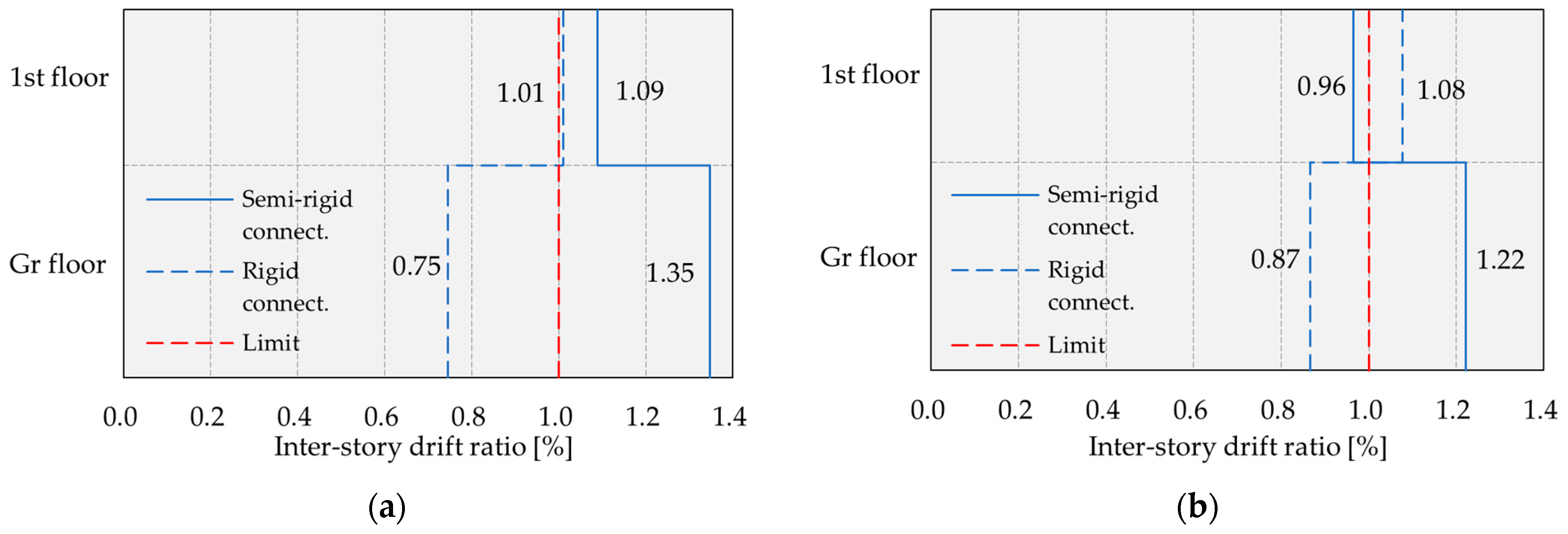 - Roof top displacements of the considered structure are larger by 16.53–66.93% when the stiffness of the connections is taken into account, compared to the case where the connections are treated as rigid. In the case of inter-story drift ratios, the values are larger by 10–100%, highlighting that inter-story drift ratios are larger than the limit value provided by standard EN 1998-1 when the real stiffnesses of connections are considered. This is especially important from the aspect of the serviceability limit state of structures in seismic regions.