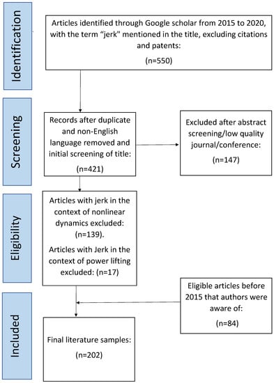 Articles in the period from 2015 to 2020 with the term “jerk” mentioned in the title were looked up in an electronic database (Scholar.google.com), excluding citations and patents. There were 550 results. The initial 550 articles was refined by excluding 129 based on title, non-English language and duplication. Of the remaining 421 articles, 147 articles were excluded in a more detailed subsequent assessment that included a review of the abstracts and conclusions, and their source, i.e., low-quality journals/conferences. Of the remaining 274 remaining articles, 139 articles that referred to jerk in the context of chaotic systems and nonlinear dynamics were excluded. Terms signaling this context include jerk system, hyper-jerk system, chaotic jerk-system, jerk attractors, jerk circuit, jerk dynamics, jerk map, jerk function, jerk oscillators and jerk equations, and traffic jerk model (n = 17) articles that used jerk in the context of weightlifting were removed, since this refers to a weightlifting technique rather than the jerk itself.
