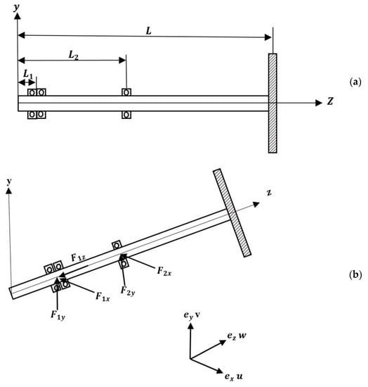 The rotor of a centrifugal pump is approximated by a simple model as shown in Figure 1a. The model is composed of a shaft of length L and supported by two bearings located at and along the shaft. u, v, and w reflect the displacement in the , , and directions, respectively.