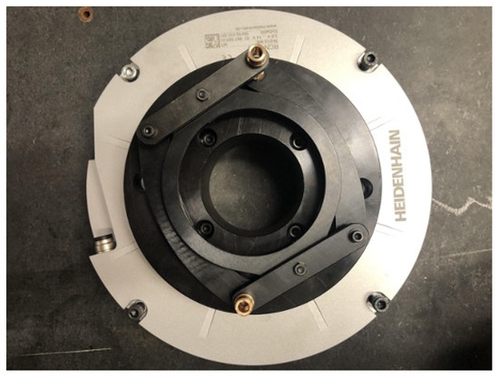 The measurement system is composed of three main devices, two encoders for evaluating the angular displacements of the two engaging gears and a torque meter for assessing the actual amount of torque transmitted by the gears. The torque meter is a T22/500 Nm from HBM GmbH that only detects the torque value without any retroactive feedback on the weights. Two Heidenhain RCN8580 encoders, shown in Figure 5, are mounted through a mechanical joint that transmits to the encoder only the rotational component of the gear shaft displacements. They are absolute angle encoders with a accuracy and measure standard DIADUR circular scales with an absolute and incremental track of 32,768 lines per revolution. Owing to the EnDat 2.2 interface, it is possible to obtain 536,870,912 (29 bits) position values per revolution.