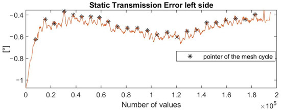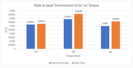 The transmission error is acquired during the motion of the weights at different torque values. It is recorded as the difference between the two encoder signals. In Figure 6, a typical trend of an acquired Transmission Error (TE) is shown. In order to extract the portion of TE due to the compliance of gear contact, a tailor-made technique was developed. In Figure 7, the evaluation of the Peak-to-Peak TE (PPTE) due to gear compliance is compared to the one computed using the GeDy TrAss software [7,8,29,30].