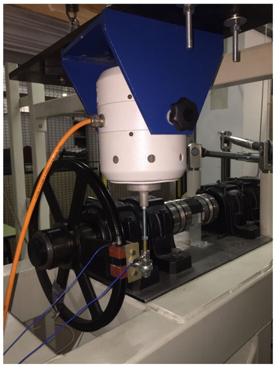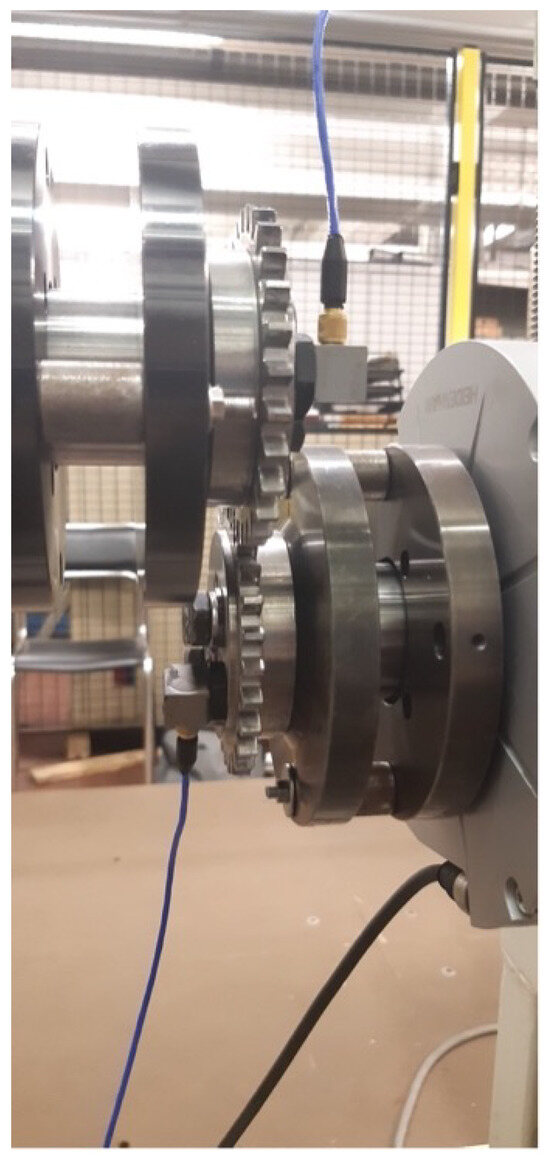 To confirm the idea expressed above, the test bench was equipped with a shaker (Dongling ESD-045 with a maximum force of 450 N in the 5 ÷ 3000 Hz range) hanged to the weight support through an elastic frame. The stinger of the shaker was then connected to a load cell to measure the tangential force applied to one of the driving pulleys. Then, the load cell was connected through a tailored support to the pulley to transform the tangential force provided by the shaker in a torque ripple on the gears. In Figure 8, the excitation system is shown. An additional accelerometer was coupled to the pulley to acquire the tangential acceleration imposed by the shaker. A spherical joint was inserted between the load cell and the pulley adaptor in order to guarantee the tangential action of the force; once the gears were positioned in the required position, the device was adjusted, and the spherical joint was tightened using a screw to avoid play and, hence, additional nonlinear effects. Two triaxial accelerometers (PCB 356A15 with a sensitivity of 100 mV/g in the 2 ÷ 5000 Hz frequency range) were then connected to the gear and, in particular, acceleration was recorded in the tangential direction to estimate the rotational acceleration of the gears. In Figure 9, the two accelerometers can be seen, and in Figure 10, the final layout of the test bench can be seen. To ensure the target level of torque, the weights were correctly engaged on the sliders, and the motion was locked through the pneumatic blocks installed on each slider. In such a way, the torque meter registered a constant torque with the shaker turned off, and the reciprocal angular position of the gears was frozen. By activating the shaker, the torque meter registers an oscillating torque across the constant-value set through the weights.
