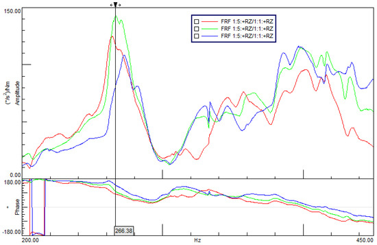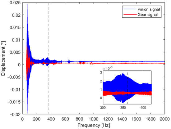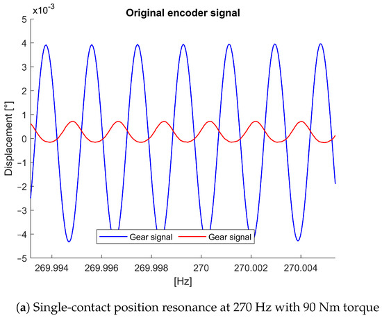 In meshing resonance, corresponding to a non-kinematic relationship of the gear motion, the angular displacements of the two gears, recorded by the encoders, become opposite. This means that in the acquisition of the encoders, the out-of-phase condition refers to a potential non-kinematic relationship between the two gears. In the range 20–2000 Hz, only one range at 360 Hz for a double-pair contact and at 270 Hz for a single-pair contact presented this out-of-phase condition, as shown in Figure 15a,b. These two frequencies were identified to be the resonance frequencies of the mating gears.