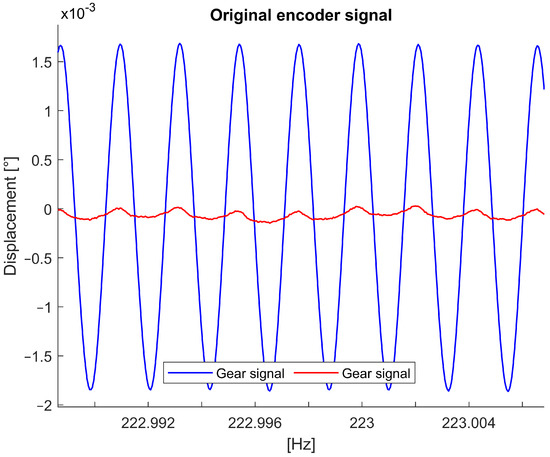 During normal working conditions, two external gears have opposite rotations due to their kinematics. The two encoders used in this test bench were mounted face-to-face, so the acquired signals in normal working conditions were synchronous because the positive sense of rotation was the same for the two gears (see Figure 14).
