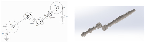 In Table 2 and Table 3, the results of the numerical model are summarized. By observing the frequencies and the mode shapes, the second natural frequency is the one with the higher dependency on mesh stiffness variation; in addition, the second normal mode presents a non-kinematic behavior of the two modal coordinates corresponding to the gear rotational motions (points 2 and 3 in the model of Figure 16 and in the modal identification of Figure 17). If the motion is kinematic, the displacements must be opposite, so the behavior of the gears reflects the correct engagement; whereas the torsional displacements are in the same direction, and the gear teeth are moving out of contact, depicting a non-kinematic movement. This condition is also highlighted by the fact that the second mode shape is the only one in which all the degrees of freedom have the same directions. Obviously, this is contrary to the standard displacement of the system. As a matter of fact, in a correct motion, nodes 1 and 2 have a rotational direction opposite to that of nodes 3, 4, 5 and 6 due to the engagement of two external gears.