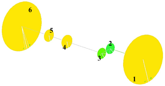 A simplified 1D model was built to further understand the test bench behavior by using the LUPOS approach [33]. The model is quite simple: because no contact losses are expected in the gear meshing, a linear lumped torsional model can be efficient and accurate enough to analyze the test bench. The rotational inertia of each element (two driving pulleys, dofs 1 and 6; two gears, dofs 2 and 3 and the two joints across the torque meter, dofs 4 and 5) was obtained from the CAD model of the test bench, and the torsional motions of these elements were the computed and measured degrees of freedom of the model. A simple linear (gear meshing, cables) or torsional stiffness (shafts and joint) connects the 6 degrees of freedom. The stiffness of the cables that connect the pulleys to the ground was estimated using measures of displacements under the load of the weights. The stiffness of the joints connecting the torque meter was set to the value provided by the manufacturer. The meshing stiffness was assumed according to the calculation performed with the GeDy TrAss software and used to connect the input and output shafts as in a block-oriented approach [34]. The meshing stiffness was estimated at different torque levels with the approach shown in [7]. In Figure 16, a sketch of the model and the CAD are shown. The resulting model was a 6 torsional-degrees-of-freedom lumped parameter system according to previous assumptions and according to the experimental measurements made on the test bench; in Figure 17, the modal identification performed in Siemens TestLab is shown. An experimental test on the test bench performed in the range of 20–2000 Hz identified the natural frequencies. The frequency response of the test bench regarding torsional modes confirmed the data evaluated using the simplified model.