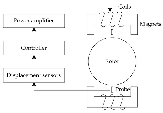 Figure 1 shows the block of the AMB-rotor control system. It contains a controller, power amplifier, electromagnet, rotor, displacement sensor and sensor probe. As the “eye” of the system, the sensor probe can detect the position information of the rotor in real time and transmit it to the controller after being converted by the displacement sensor. The controller provides the control value to the power amplifier based on the difference between the set value of the rotor and the signal measured by the displacement sensor. The power amplifier outputs the current with different amplitudes and directions. The control current is then exerted on each electromagnetic coil to produce corresponding active magnetic forces to suspend the rotor in a given position. The whole process above constitutes the closed-loop control AMB-rotor system.