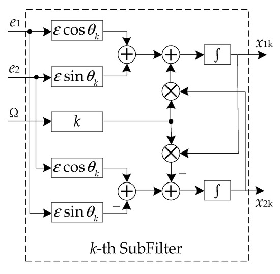 where Ω is the rotational frequency, and ε is the positive convergence parameter. The signals and are the inputs which contain harmonic sinusoidal signals and . and are the phase and amplitude of . and are orthogonal, so there are