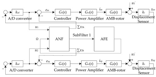 The adaptive notch filter for harmonic sinusoidal signals and the adaptive frequency estimation algorithm are used to decrease the harmonic current in the AMB-rotor system. The structure of harmonic current suppression is illustrated in Figure 10. and indicate the harmonic disturbances which contain unbalanced vibration and SR. Gp(s), Gw(s) and Gc(s) are the Laplace transforms of the rotor, power amplifier and controller of the AMB-rotor system, respectively. kad is the sampling factor of A/D converters, and ks is the magnification of the displacement sensor.