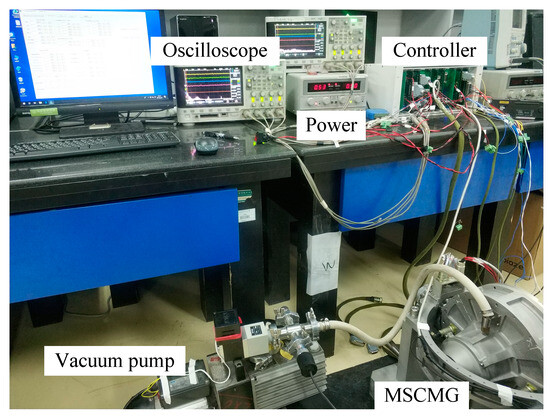 To further verify the correctness of the micro-vibration mechanism analysis and the feasibility of the proposed harmonic current suppression algorithm with adaptive frequency estimation, a simulation using MATLAB and an experiment using an MSCMG whose rotor is levitated by AMBs have been presented. The experimental setup is illustrated in Figure 11. A UPS is used to prevent sudden power outages. A vacuum pump is made to maintain a vacuum degree for rotor operation. The proposed method with frequency estimation is executed in the controller with a TMS320F28335. The sampling frequency of the digital signal processor is 6.67 kHz. The radial channels are decoupled from each other, the structure is symmetrical, and the parameters of these two AMBs are consistent. So, the channels of AX and AY are studied in this paper. The parameters of MSCMG are presented in Table 1. Gp(s), Gw(s) and Gc(s) can be described as