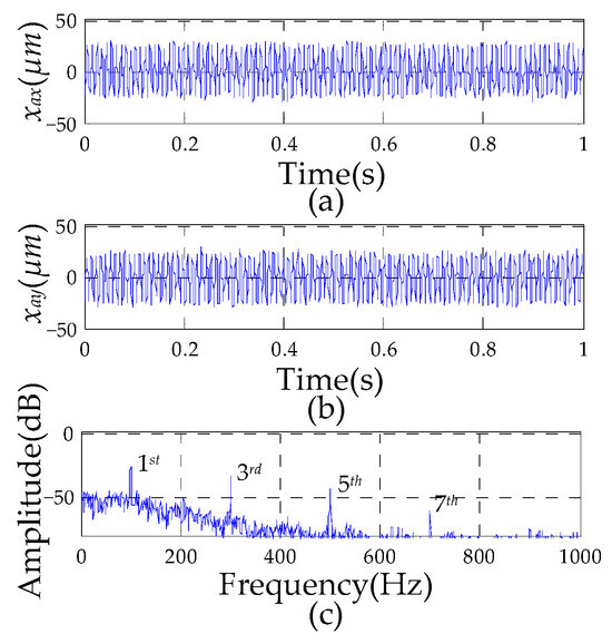 The correctness of the micro-vibration mechanism analysis is first experimentally confirmed. In Figure 14, the amplitude of the rotor displacement in the AX channel and the AY channel is about 25 μm. And the FFT analysis of the AX channel displacement signal in Figure 14c shows that there are only obvious odd harmonic components and no even harmonic components in the displacement signal. The amplitudes of the first to the seventh odd harmonic components in the AX channel displacement signal are −26.3 dB, −34 dB, −44.2 dB and −60.1 dB, respectively.