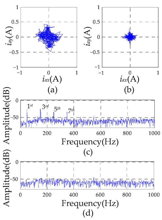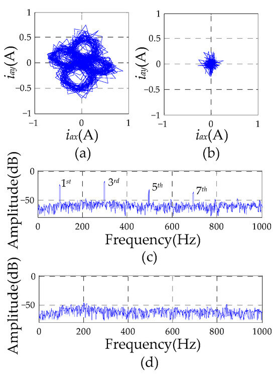In Figure 15 and Figure 16, the experimental results of the control current in the AX channel and the AY channel before and after implementing the proposed method are illustrated. Due to the presence of only odd harmonic components, the proposed method with the first to the seventh odd harmonic components is considered. The rotating frequency is 50 Hz and the parameters are set to θ1 = 5pi/4, θ3,5,7 = pi/4 in Figure 15. From Figure 15a,c, it can be found that the original control currents in the A-end are about 0.4A, and the first to the seventh odd harmonic components in the A-end control current are −27.1 dB, −24.8 dB, −35.1 dB and −35.2 dB. However, the control current with the proposed method is about 0.15A, which is 37.5% of the primitive amplitude, and the first to the seventh odd harmonic components of the current reduce to −54.9 dB, −51.3 dB, −55 dB and −55.2 dB, which are submerged in noises.