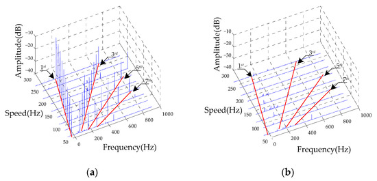 The adaptive characteristics of the proposed harmonic current suppression algorithm are also validated in a run-up experiment. The rotor accelerates from 50 Hz to 250 Hz during the run-up experiment. The FFT analysis of the radial control currents in the AX channel is recorded with a waterfall chart for every 25 Hz in Figure 17. Figure 17a shows the radial control current spectrum without the proposed suppression method. The harmonic components of the radial control current in the AX channel are apparent. However, the first to the seventh odd harmonic components with the harmonic current suppression method in Figure 17b are significantly reduced. It indicates that the proposed method in the AMB-rotor system is feasible over a wide range of rotational speeds.