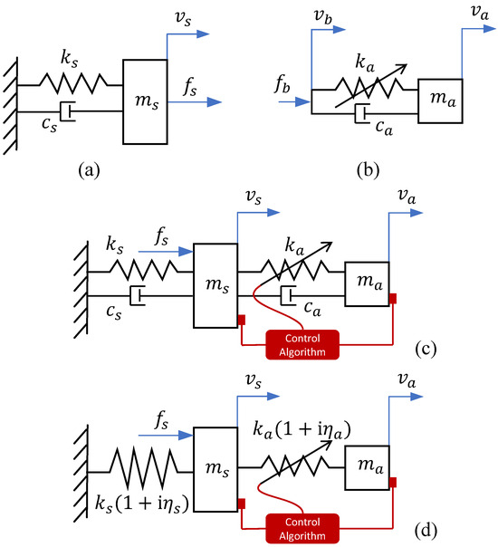 (a) A single-degree-of-freedom host structure with viscous damping; (b) an ATVN with viscous damping; (c) Host structure and ATVN with viscous damping; (d) Host structure and ATVN with hysteretic damping.