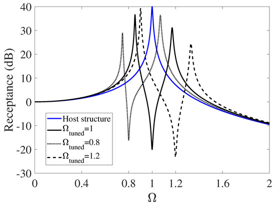 Receptance of a single-degree-of-freedom host structure with viscous damping (continuous blue line) and receptance of the host structure with an ATVN tuned at the natural frequency of the host structure (continuous black line) and twenty percent below and above the natural frequency of the host structure (dotted and dashed black lines).