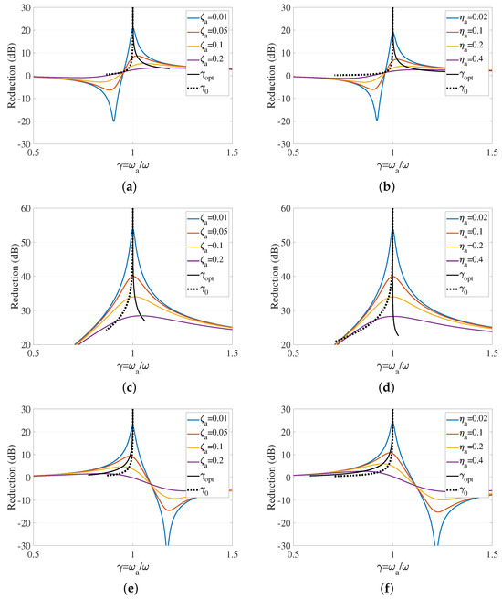 Figure 3b,d,f illustrate the variation in the reduction factor D with the tuning ratio for diverse levels of structural damping, considering excitation frequency ratios , and . The continuous black line highlights that optimal tuning consistently tracks the maximum reduction level across varying loss factor values .