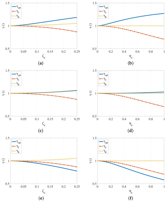 Optimal, quasi-optimal, and approximated tuning as a function of the damping for viscous (a,c,e) and structural (b,d,f) damping (): (a) and ; (b) and ; (c) and ; (d) and ; (e) and ; (f) and .