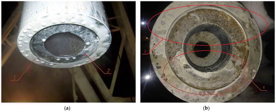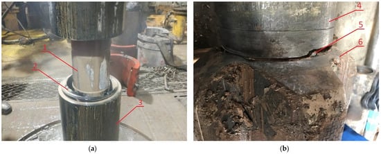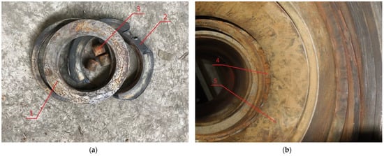 The case of the destruction of the threaded nipple of the adapter between the PDM and the at-bit shock absorber: (a) View of the destroyed element of the drill string immediately after lifting from the well; (b) A detailed inspection of the place of damage to the tool; 1—the thrust end of the threaded coupling; 2—part of the adapter’s nipple; 3—zone of fracture, 4—zone of crack formation and propagation.