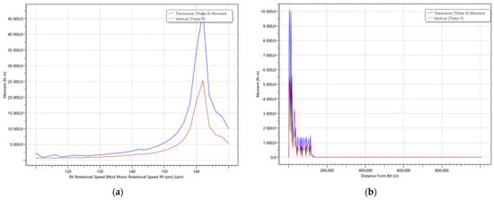 Analysis of the dynamics of the considered BHA was carried out using the specialized Halliburton (Duncan, OK, USA) software product, Wellplan-Software (version 5000.14.0) []. Figure 2a shows the dependence of the maximum bending moment in the drill string on the speed of the tool rotation (here, drilling was carried out in a combined way: a maximum of 99 rpm was provided by the PDM, and the rotor was used to increase the speed). Note that the z-axis is directed along the axis of the drill string, and the x- and y-axes are the main central axes of the cross-section of the string. One can see on this graph that at a rotation speed of around 162 rpm, there was a sharp disturbance of the bending moment, which reached more than 45 kNm. At the same time, Figure 2b illustrates that at a safe drilling speed, the maximum bending moment in any of the sections of the column did not exceed 10 kNm (the maximum value was registered in the area of the threaded adapter between the hydraulic cylinder and the shock absorber). In fact, the forced mode of drilling led to the occurrence of an excessive bending moment, which ultimately caused the emergency.