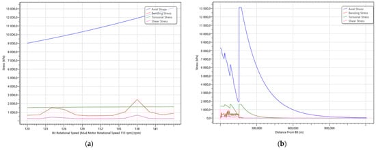 Such damage is caused by the excessive impact of axial vibrations on the bearing support of the engine and the high contact stresses that occur during the dynamic contact interaction between the support elements. Since the shock absorber was installed above the PDM, the thrust bearings of the spindle section turned out to be unprotected from vibration loads. In general, during the drilling of the Cretaceous, Jurassic, and Triassic systems with ball bits in the oil and gas fields of the Dnipro–Donetsk Basin, significant axial oscillations were observed at the wellhead when an axial load of more than 10 tons was created. In the case under consideration, an axial load of up to 18 tons was used on the bit; at the same time, there were no vibrations of the drill string and the oil system at the day surface, and no danger was visually observed (the shock absorber was activated above the PDM). Using the specialized software package “Halliburton: Wellplan-Software (version 5000.14.0)” [], the stresses that arose in the BHA elements were analyzed. The graphs (Figure 4a) show the dependence of the maximum stresses in the drill string on the rotation speed. Figure 4b illustrates the distribution of stresses along the length of the column at the maximum rotation frequency of 144 rpm. It should be noted that the stresses on the graphs did not exceed the limit values; however, vibration loads at a high speed of rotation of the tool led to high dynamic contact stresses and caused damage to the PDM thrust bearing.