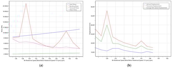 The maximal stresses and displacements in the bottom elements of the drill string: (a) Dependence of the maximum stresses on the rotation speed of the drill string; (b) Dependence of the maximum movements on the rotation speed of the drill string.