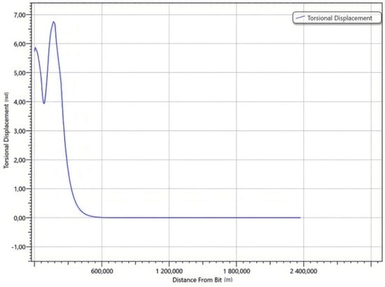 The conclusion of the analysis of the emergency is that the damage was caused by distortion of the stick–slip torsional vibrations. Usually, when the reactive moment is released, the stabilizers are unscrewed, since the rotation of the drill string occurs in the opposite direction to the direction of the thread. In this situation, after the bit was jammed, there was a sharp start of the PDM with high angular acceleration, which led to the attachment of the threaded connection of the stabilizer and, as a result, to the violation of its integrity. According to the authors, the fracture of the threaded connection of the upper adapter of the angle regulator occurred simultaneously with the fracture of the stabilizer under the action of the same dynamic loads. The estimate of the relative angle of twisting of the BHA when a dynamic torque occurs was simulated in the “Halliburton (Duncan, OK, USA): Wellplan-Software (version 5000.14.0)” environment [] and is presented in Figure 8. In the lower part of the drill string, we observed a disturbance in the angle of rotation of the cross-sections of the string around its longitudinal axis. In particular, the cross-sections of the PDM were turned more than a full revolution relative to the conventionally stationary cross-section of the column.