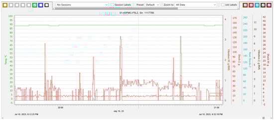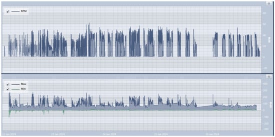 The software product WatsonTM (“Innova Power Solutions”, Canada) (Figure 10) is used to read the data, in the interface of which it is possible to change the scale of the curves and graphically visualize various parameters, including the temperature, rotation frequency, vibrations, and shocks along three mutually perpendicular axes []. The advantage of this interface is that digital data can also be obtained in a format convenient for further processing and interpretation; for example, they are available not only in the form of diagrams but also in the form of tables with a set of numerical data. The device has its own digital clock and records the event with reference to time. When connecting the controller to the computer, time synchronization occurs, which allows one to get a clearer picture of the pitting data. The device allows one to record the mean square value of the vibrations, as well as longitudinal and transverse vibrations along three axes, and can work at temperatures up to 180 °C. The unit of measurement of vibrations is g, and the frequency of data registration is within 10 s.
