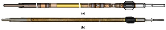 An important problem that needs a rational solution is the way of placing the sensor to record vibrations and the power battery in the lower part of the drill string. Extremely limited diameter space and extreme operating conditions significantly complicate this task. Depending on the specific drilling conditions and the requirements for the downhole vibration recording system, its placement can be performed in different ways. Sometimes, sensors are built directly into the diametrical pocket of the drill string wall, or sensors, together with power elements, can be placed in special external modules that are attached to the outer surface of the drill string and have protective casings or shells [,]. The study proposes to place the recording device in a specially made module, which is mounted inside the lower part of the drill string. Creating such a module requires attention to design, materials, and the fastening method. The module is specially designed to accommodate the necessary sensor, the lithium thionyl chloride battery, and electronic communications. The module material is resistant to corrosion and abrasive materials, and the module is sealed to protect the electronics from moisture, dirt, and other harmful influences. The module is made as compact and ergonomic as possible to reduce its impact on the drill string diameter and to leave more space for the drilling fluid to flow, and the external shape facilitates the smooth movement of the drilling fluid around the module.